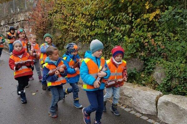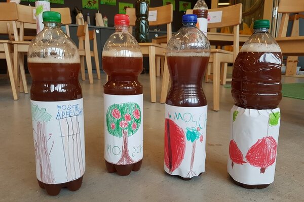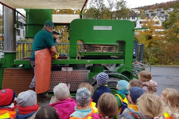 Die Mostbauern Laube aus Lengnau demonstrierten mit ihrer imposanten Mostpresse den ganzen Prozess vom Apfel zum Most. Die Kinder kamen aus dem Staunen nicht mehr heraus - das war wunderbares Kino! Zum Schluss wurde jedes Kind mit einer Flasche frisch gepresstem Most und einem feinen Znüni beschenkt.