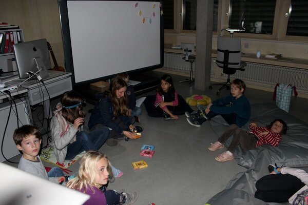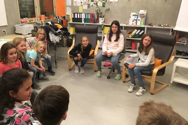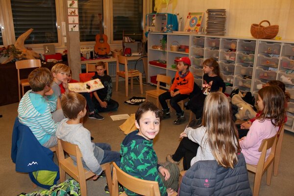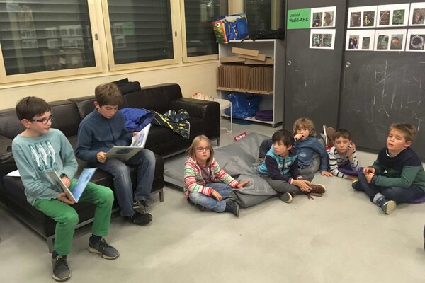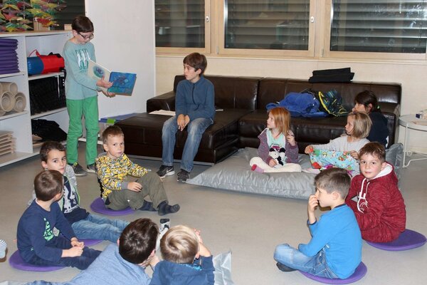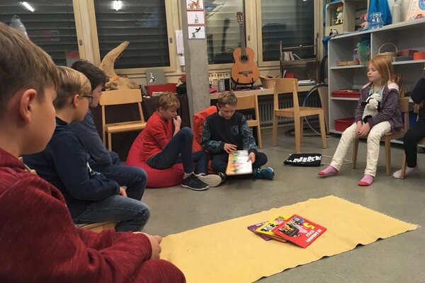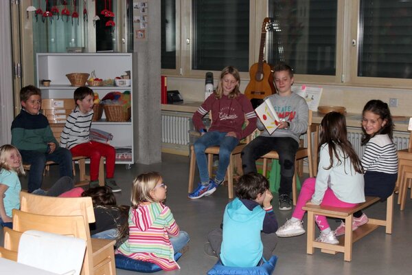Kurz vor 19:00 Uhr verteilten sich die altersdurchmischten Gruppen in die zwei Schulhäuser und die verschiedenen Zimmer, wo auch schon die Lehrpersonen und die 6.Klässler mit ihren Büchern auf sie warteten. Die Kinder machten es sich in den Leseecken bequem und lauschten den verschiedenen Geschichten, die ihnen vorgelesen wurden.